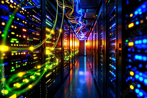 Vibrant Server Room with Fiber Optic Cables and LED Lights