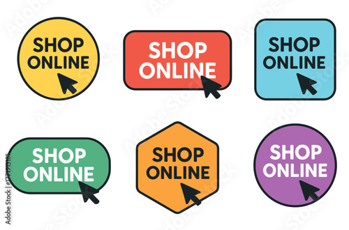 Vibrant shop online icons with mouse cursor in various shapes and colors
