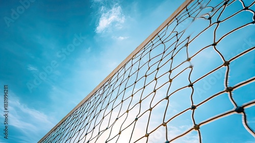 Vibrant Sky with a Volleyball Net Framed Against a Bright Blue Background and Soft Clouds Illuminated by the Sun's Warm Glow