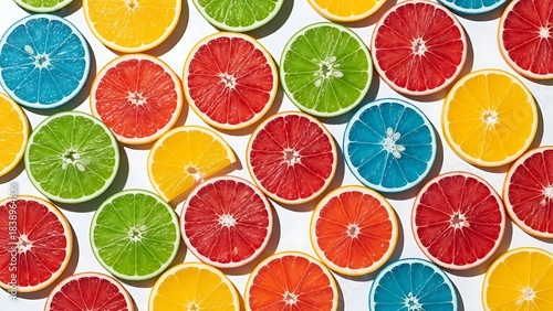Vibrant Slices of Colorful Citrus Fruits Arranged Artfully on a White Background, Top-Down View