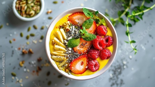 vibrant, smoothie, bowl, top, fresh, fruit, seed, mint, leaves, balance, yogurt, nourishment, calcium, vegan, cereal, flower, banana, dessert, berry, healthy, size, plate, texture, cookery, background, diet, dairy, refresh, layer, delicious, brunch, protein, scatter, decor, strawberry, wooden, menu, garnish, portion, serve, favor, morning, summer, crunch, bite, light, raspberry