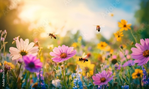 Vibrant Spring Meadow with Wild Flowers and Bees, AI generated illustration