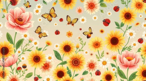 sunflower, daisy, butterfly, coccinellidae, anemone, floral, pattern, seamless, summer, spring, colourful, vibrant, bright, cheerful, happy, optimistic, textile, wallpaper, design, illustration, flower, insect, nature, background, texture, repeat, garden, botanical, pastel, detailed, whimsical, joyful, beauty, delicate, artwork, vector, graphic, element, image, digital
