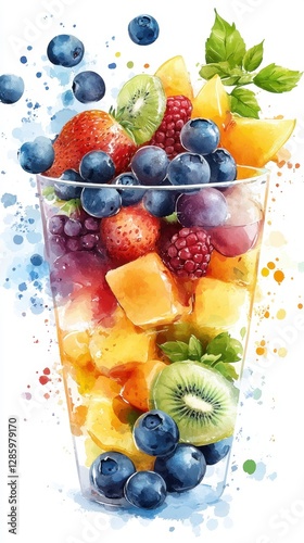 fruit, cocktail, berry, kiwi, summer, vibrant, refreshing, healthy, drink, colourful, strawberry, blueberry, raspberry, mango, tropical, fresh, juicy, vitamin, nourishment, citrous, dessert, garnish, artistic, watercolor, splash, diet, creative, design, print, exotic, leaf, art, illustration, sweet, natural, food, culinary, beverage, epicure, favor, decoration, arrangement, delicacy