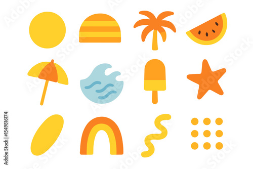 Vibrant summer icons with sun, sea, and tropical elements in warm tones