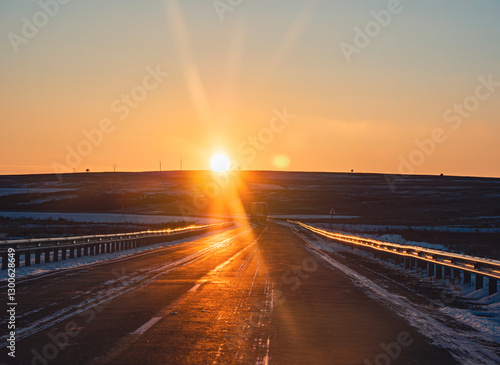 Vibrant sunrise over an empty road in winter landscape, showcasing nature's beauty and serenity