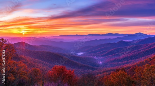 sunrise, sunset, mountain, hill, autumn, fall, foliage, leaf, red, orange, purple, blue, sky, cloud, landscape, nature, scenic, view, vista, panorama, travel, scenery, outdoors, environment, beauty, majestic, vibrant, colourful, tranquil, serene, peaceful, wilderness, range, vale, mist, fog, light, colours, horizon, peak, ridge, tree, wood, forest, air, image, photo, picture, background