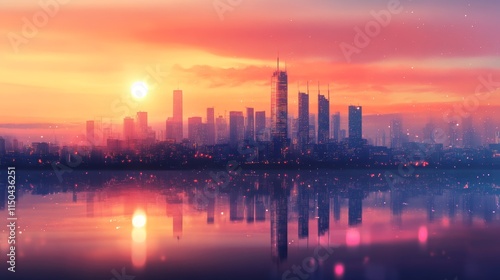 Vibrant Sunset Over a Modern City Skyline Reflecting in the Calm Water Showcases a Breathtaking End to the Day