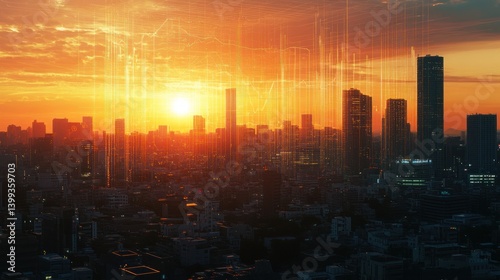 Vibrant sunset over a sprawling cityscape, showcasing modern skyscrapers and a dynamic atmosphere.