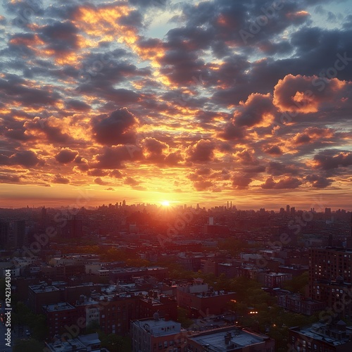 Vibrant Sunset Over Bustling City Skyline with Dramatic Cloudy Skies