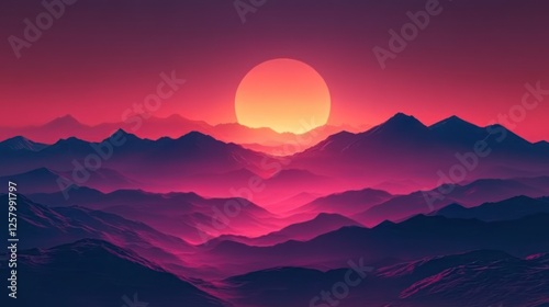 Vibrant sunset over majestic mountains with layered silhouettes and colorful sky at dusk