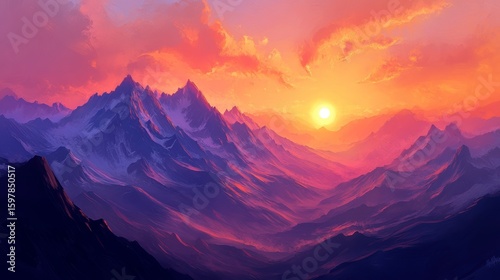 sunset, mountain, landscape, nature, scenic, view, sky, cloud, sun, peak, range, hill, horizon, colours, vibrant, orange, pink, purple, blue, snow, cold, winter, majestic, beautiful, awesome, amazing, incredible, stunning, breathtaking, picturesque, serene, tranquil, calm, peaceful, idylli, fantasy, art, illustration, digital, graphic, design, image, photo, wallpaper, background