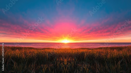 sunset, ocean, sky, grass, vibrant, colours, beach, nature, landscape, horizon, cloud, sunrise, sea, summer, dusk, dawn, light, beauty, calm, peaceful, tranquil, serenity, evening, day, gold, red, pink, orange, blue, purple, scenic, view, picturesque, amazing, spectacular, majestic, marvellously, awesome, incredible, breathtaking, stunning, beautiful, idylli