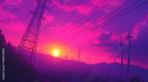 Vibrant Sunset Over Wind Turbines and Power Towers