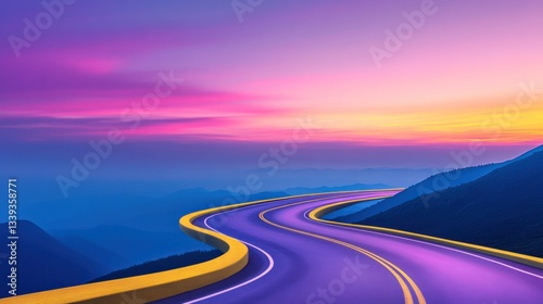 road, highway, mountain, sunset, sky, landscape, purple, yellow, pink, orange, curve, winding, scenic, travel, journey, adventure, horizon, nature, view, beautiful, serenity, calm, peace, calmness, freedom, exploration, destination, path, way, route, drive, trip, vacation, holiday, escape, summer, evening, twilight, colours, panorama