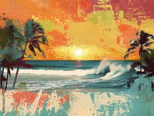surfing, wave, sunset, beach, palm, tropical, ocean, water, landscape, nature, summer, scenic, seascape, coastline, vacation, paradise, island, sun, sky, art, graphic, design, pattern, abstract, vibrant, colours, dynamic, energetic, pop, motion, creative, season, sea, shore, coast, sunrise, sandy, surf, board, sport, activity, adventurous, outdoors, scenery, picturesque, atmospheric, serene, tranquil, idylli