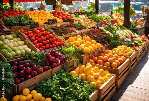 vibrant tidy fresh produce display emphasis safety cleanliness attract health conscious shoppers, artistic, presentation, bright, colors, organic