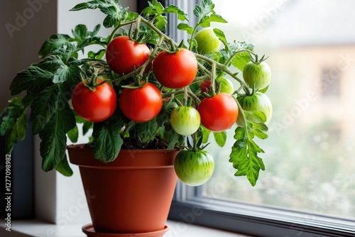 tomatoes, plant, red, green, fruit, sunlight, indoor, gardening, freshness, vibrant, home, nature, healthy, organic, pot, growth, window, vegetable, leaf, rich, agriculture, nurturing, decor, harvest, lifestyle, seasonal, edible, flora, beauty, arrangement, natural, environment, care, cultivation