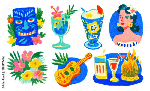 illustration, tropical, art, cocktail, flower, tiki, glasses, colours, woman, guitar, decoration, beverage, palm, vibrant, summer, exotic, design, concept, character, style, isolated, background, party, fun, nature, graphic, cheerful, creative, flora, celebration, culture, joyful, scenery, artistic, retro, layout, charming, festive, vintage, image, composition, bright, hand-drawn