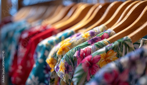 Vibrant tropical floral shirts displayed on wooden hangers evoke summer vacation vibes and retail appeal