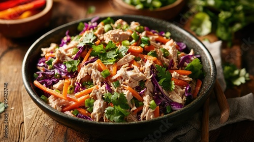 vibrant tuna salad with shredded cabbage, carrots, and bell peppers, all tossed in a sesame-ginger dressing for a burst of flavor.