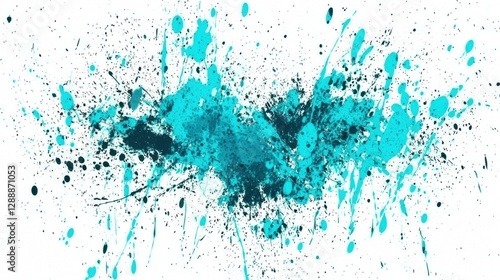 Vibrant turquoise splatter art on white backdrop showcasing energy and creativity in abstract design