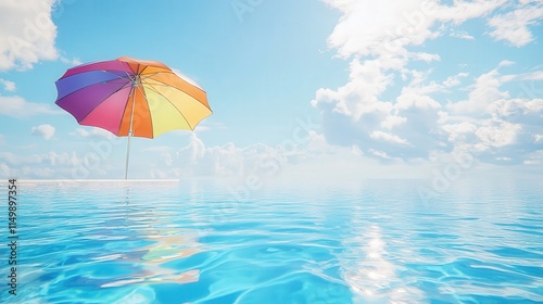 vibrant umbrella standing by a sparkling swimming pool on a sunny day, with clear blue skies and calm water, perfect for a relaxing moment by the poolside