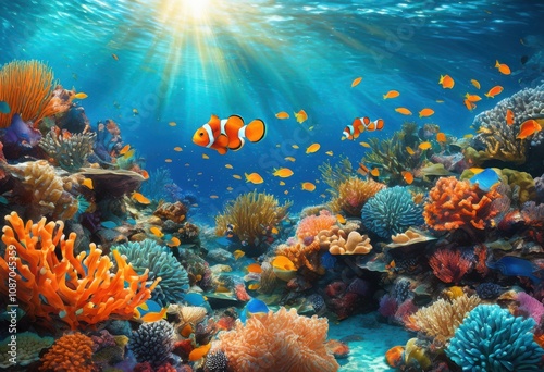 vibrant underwater coral reef close showcasing colorful marine life lush textures captivating submerged environment, adventure, algae, aquatic, beautiful