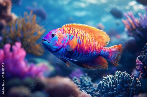 Vibrant underwater scene capturing a colorful parrotfish gracefully nibbling on delicate coral structures in nature