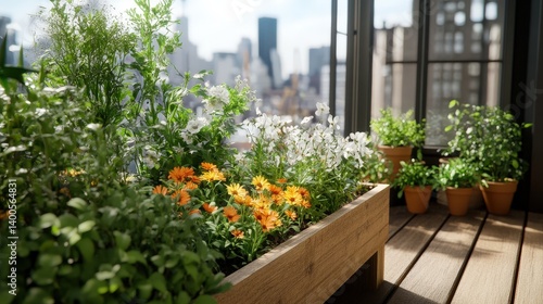 Vibrant Urban Garden on Balcony with Colorful Flowers and Lush Green Plants Against City Skyline