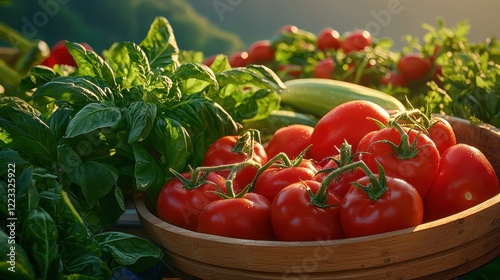 Vibrant vegetable market display open-air setting golden hour light side angle view nature's bounty