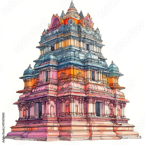 temple, india, architecture, watercolor, illustration, colourful, vibrant, ornate, detailed, religious, culture, travel, asia, religious building, spirituality, design, artwork, painting, intricate, ancient