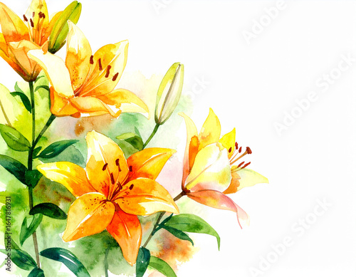 vibrant watercolor painting of a bouquet of white lilies in full bloom. The delicate white petals are complemented by lush green leaves and a budding flower, all set against a soft, abstract