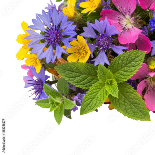 Vibrant wildflower bouquet with cornflowers yellow blooms pink geraniums and fresh mint isolated on white background