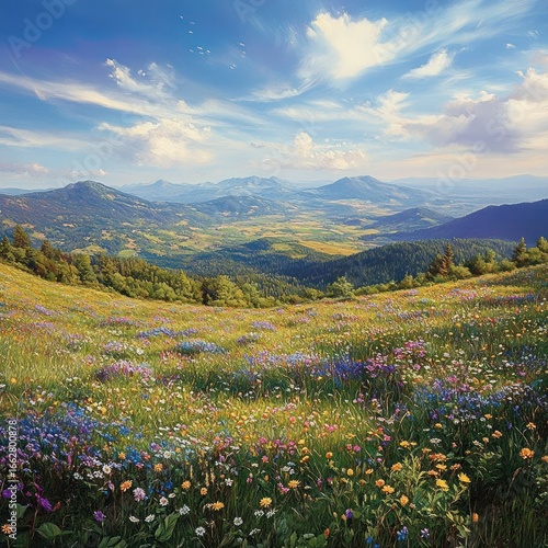 Vibrant wildflower meadow on a hillside with lush green forests and distant mountain ranges under a bright blue sky with scattered white clouds