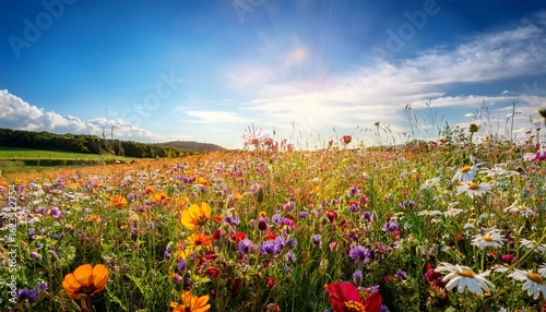 vibrant wildflower meadow under bright sunlight with rolling mountains in background