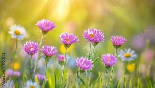 Vibrant wildflowers in a sunny meadow. Pink and white flowers bloom amidst green grass, bathed in golden sunlight