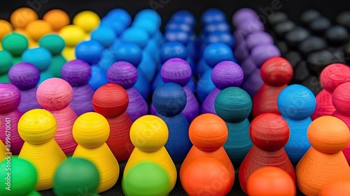 Vibrant wooden figures in a spectrum of colors arranged in neat rows, showcasing diversity, unity, and organization against a black background.