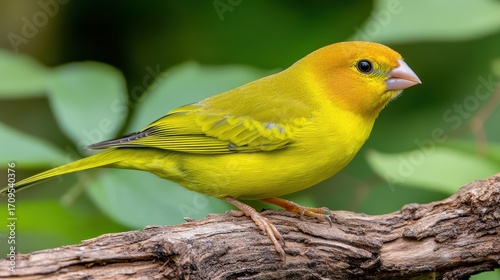 Vibrant Yellow Bird Perched on Branch Against Lush Green Background