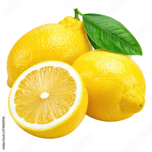 Vibrant yellow lemons with a cross-section revealing juicy segments, with a green leaf