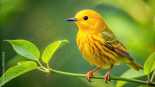 Vibrant yellow warbler perches on delicate green leaf, showcasing intricate feathers, bright beak, and delicate legs in stunning macro detail against soft blurred background.