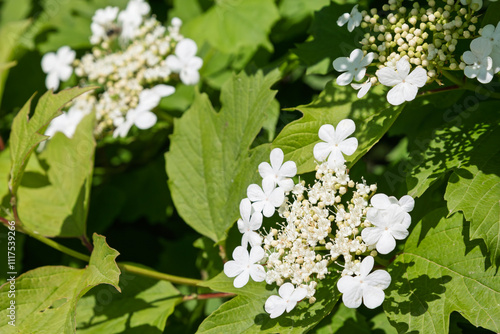 Viburnum vulgare blooms with white flowers during flowering. Cluster of white viburnum flowers with green leaves in sunlight. Outdoor close-up botanical photography showing blooming details.
