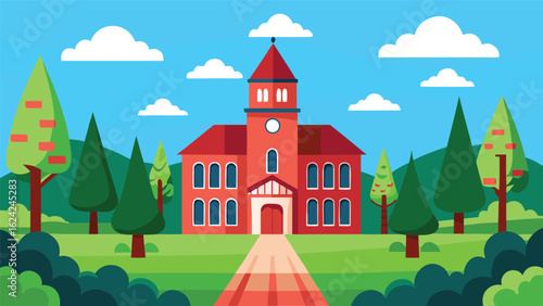 victorian, architecture, school, building, vector, educational, institution, historic, flat, design, tree, illustration, landscape, sky, with, cloud, green, park, pathway, campus, scene, architectural, vintage, scenic, view, nature, background, editable, graphic, classic