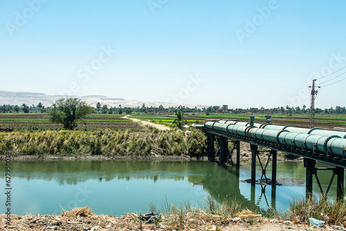 View across rural egypt near river Nile in Egypt rural countryside landscape with fields near riverbank