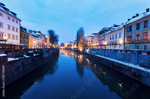 no people, horizontal, outdoors, dusk, illuminated, building exterior, architecture, capital city, waterfront, slovenia, ljubljana, river, winter, evening, panorama, landmark, building, city landscape, city, travel, night, downtown, blue, bridge, snow, nobody, open air, outside, exterior, exterior, sunset, twilight, sundown, vanishing point, illumination, lighting, lit up, facades, architectural, urban scene, slovene, slovene, europa, european, waterway, wintery, season, reflecting, eve, landmark, built structure, building, night time, night time, blue color, bridge, weather, evening, dusk, illuminating, lit, illumination, construction, planning, capital city, capital, oceanfront, coast, inner city