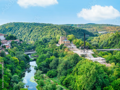 View from above with Boris Denev State Art Gallery and Monument to the Assen Dynasty two main tourist attraction in Veliko Tarnovo, Bulgaria