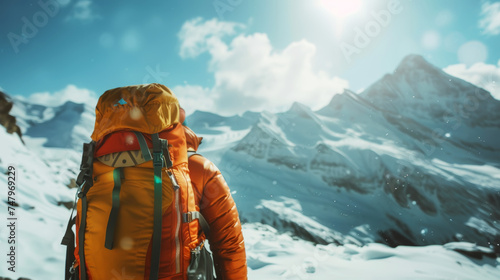 View from back on fully equipped mountaineer in the snowy mountains. Snow storm. Alpinism concept. Generative AI