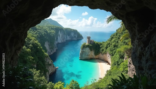 View from cave to tropical island bay with turquoise water lagoon, sandy beach and cliffside castle ruin. Rich green jungle covers steep rocky shores. Scenic ocean landscape.