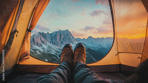 View from inside a tent showing hiker's feet resting, with stunning mountain landscape during sunset in background