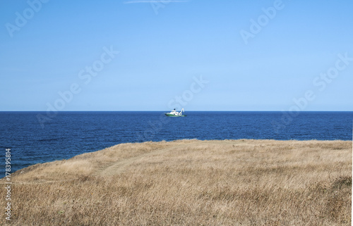 sea, sky, nature, blue, coast, landscape, ocean, water, horizon, travel, shore, panorama, coastline, seascape, calm sea, blue sea, salt water, clear, clear sky, background, sky background, fishing, fishing boat, boat, vessel, seacoast, clear day, scenic, view, sunny, summer
